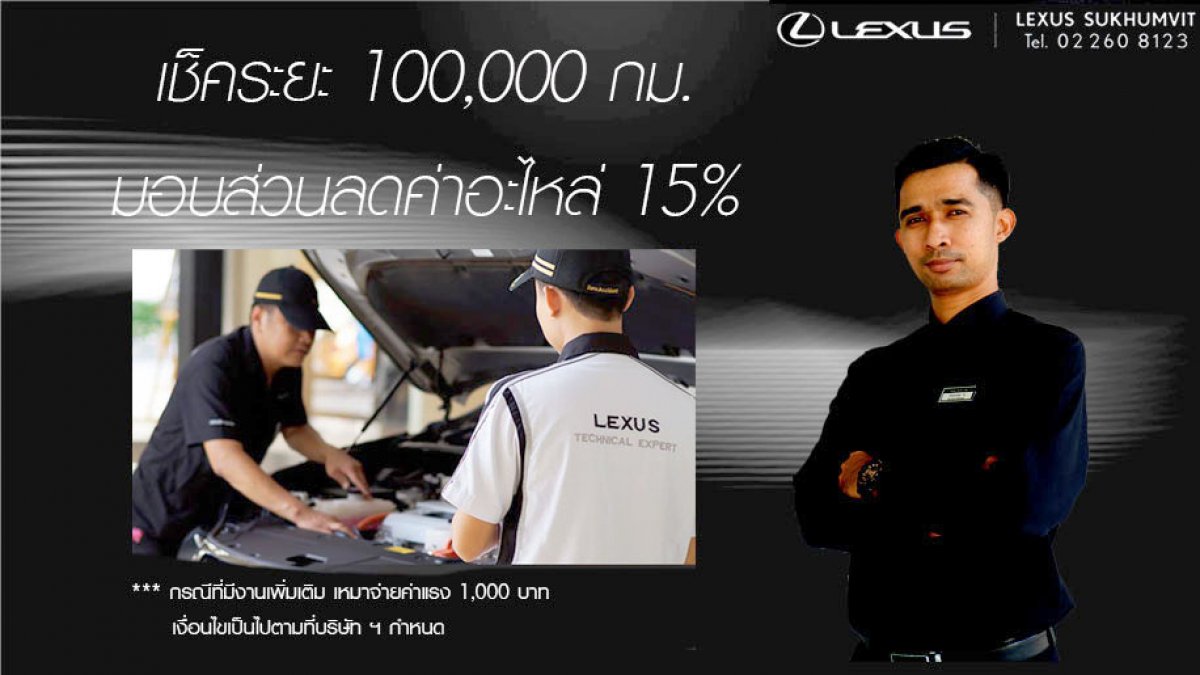 *** วันนี้ลูกค้านำรถยนต์เลกซัสเข้าเช็คระยะ 100,000 กม. ณ ศูนย์บริการรถยนต์เลกซัส (สาขาสุขุมวิท) รับส่วนลดอะไหล่ 15%